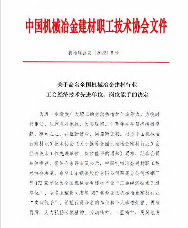 近日,中國機械冶金建材職工技術協會發布了《關于命名全國機械冶金建材行業工會經濟技術先進單位、崗位能手的決定》。其中,招金礦業工會委員會獲評“工會經濟技術先進單位”稱號。