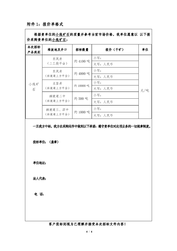 4.如無異議,請投標人將此招標文件和報價單加蓋企業公章(或按捺手印)原件掃描后發送至指定投標郵箱;報價單所需填寫的數據原則上要求電子版,若手寫須大小寫注明,如有涂改、不清晰或大小寫不一致的視為廢標。其他未盡事宜,以中標后簽訂的合同條款約定為準。