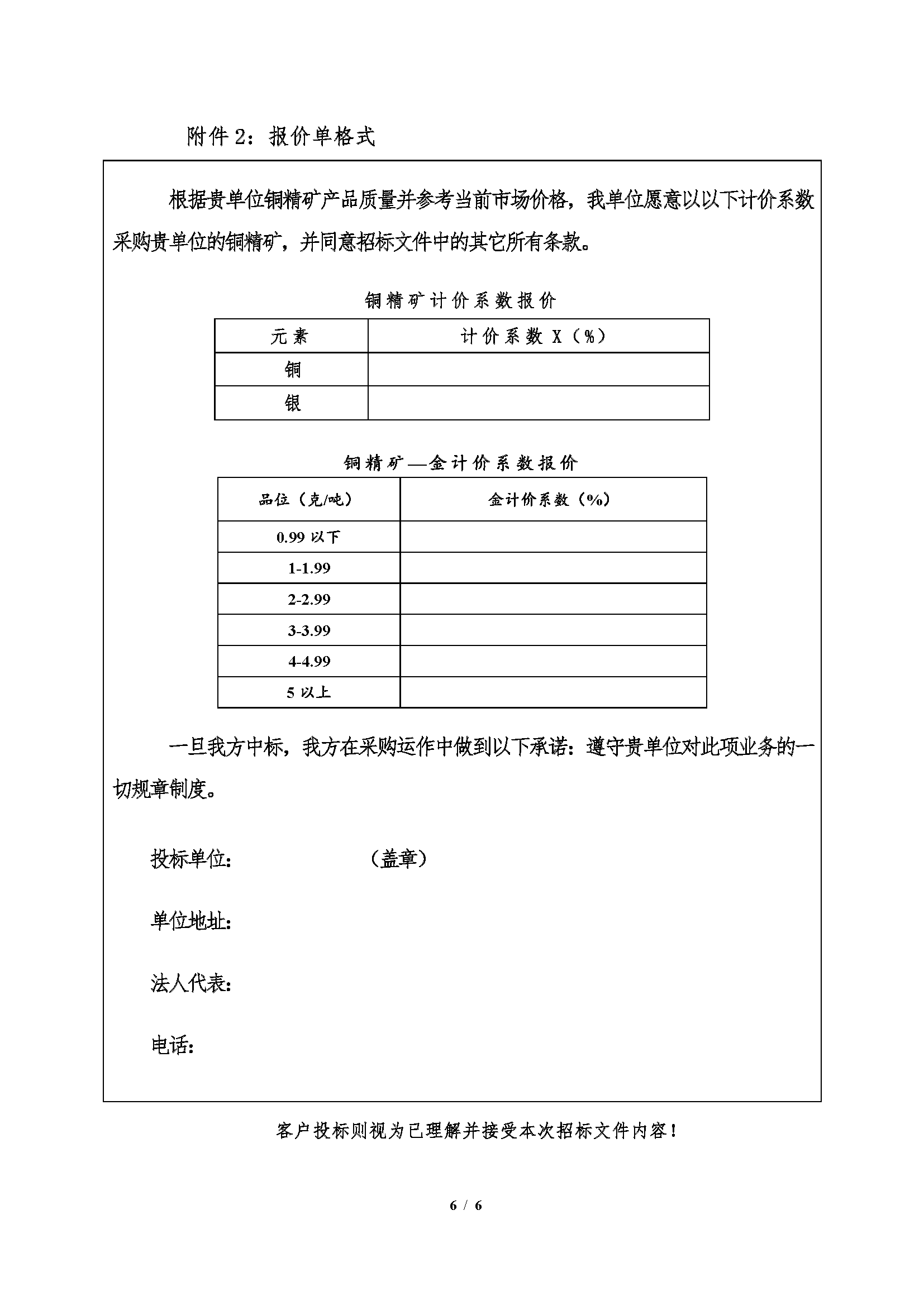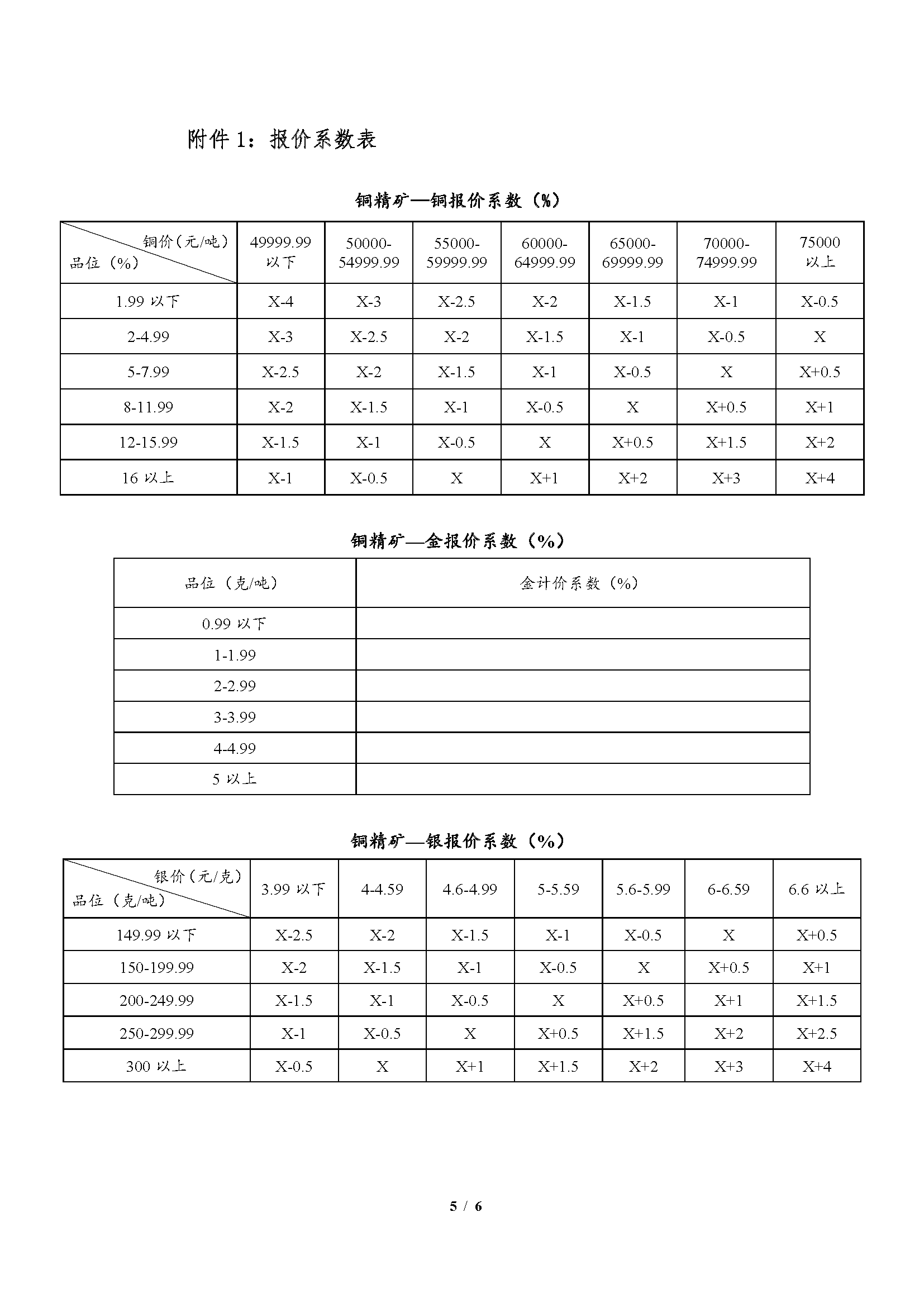 2.本次招標為一次性報價,在標書報送截止后現(xiàn)場制定底標并在規(guī)定時間內(nèi)進行開標。本次招標以我單位檢測的本批次礦各元素平均品位對應(yīng)的報價系數(shù)測算出綜合單價,每干噸礦計算的價值最高者得。