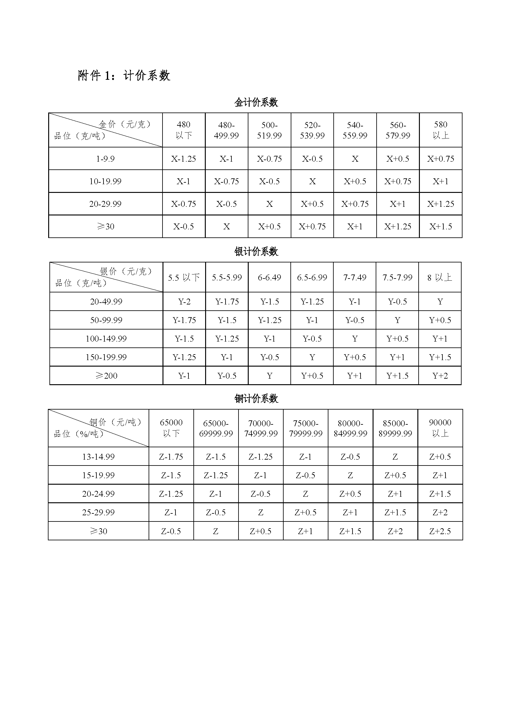 基準報價系數不得超過99%。其中金品位≥1克/噸計價,銀品位≥20克/噸計價,銅含量≥13%進行計價。